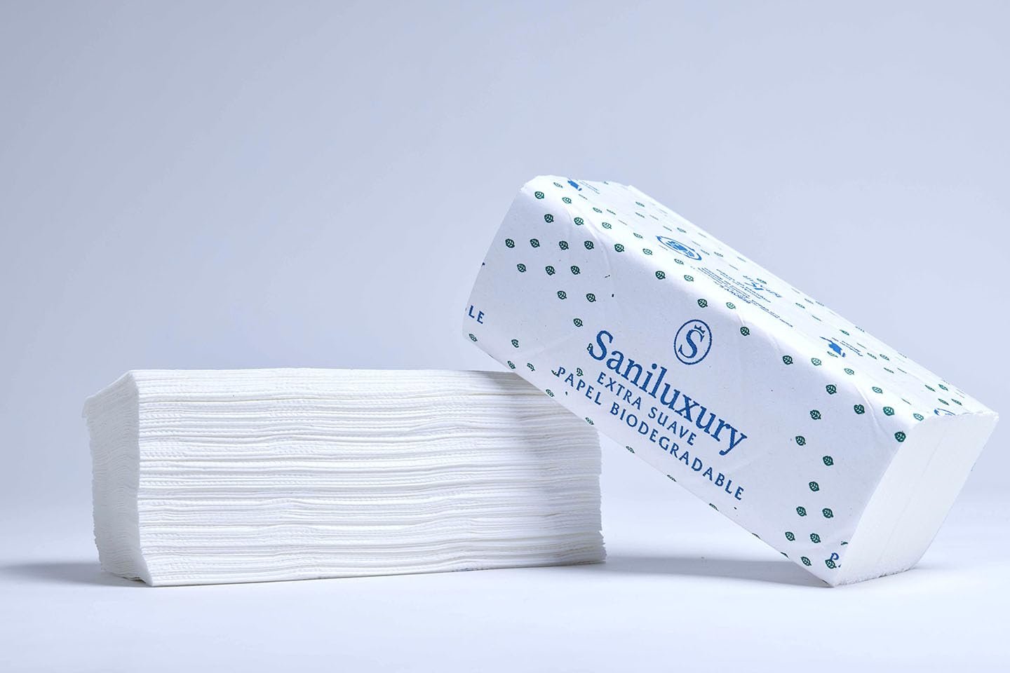La Toalla interdoblada Saniluxury es una toalla de papel de alta calidad, suave, absorbente y resistente, hecha de fibra virgen y diseño de doble hoja doblada en «Z», ideal para secado de manos eficiente en baños comerciales, ofreciendo una excelente imagen de higiene.